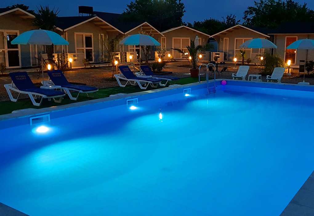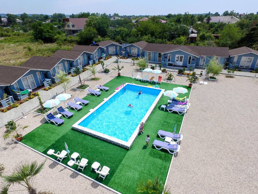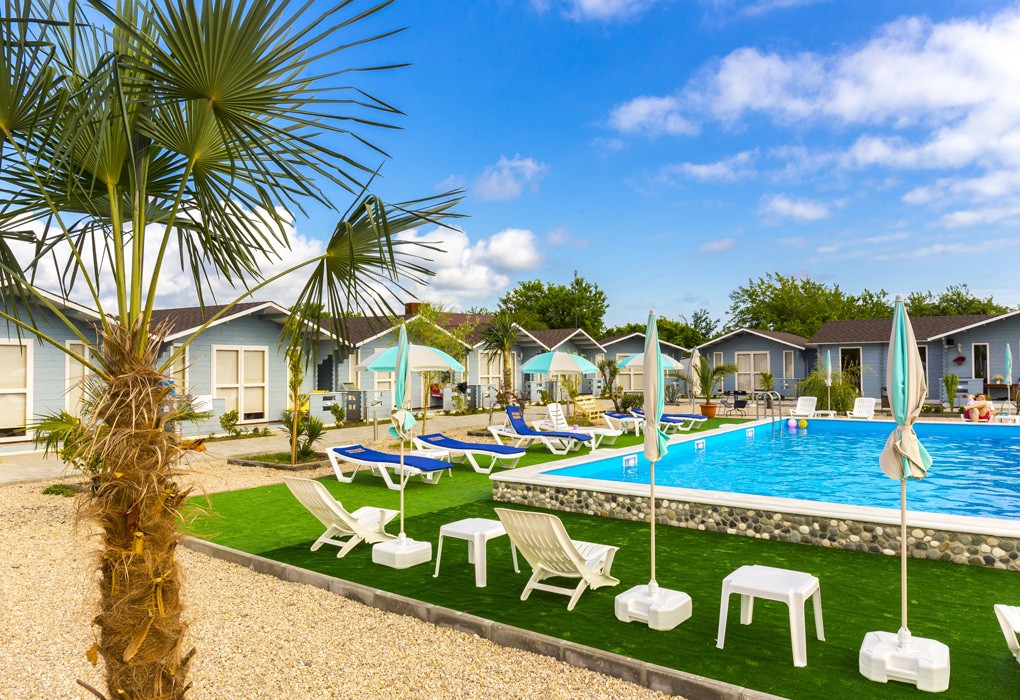 Коттеджный комплекс представляет собой огороженную территорию с пальмами, цветущими клумбами и зелеными кустарниками. Есть зона барбекю, детская игровая площадка и открытый бассейн с подогревом и зоной отдыха, пользоваться им можно без ограничений по времени.
