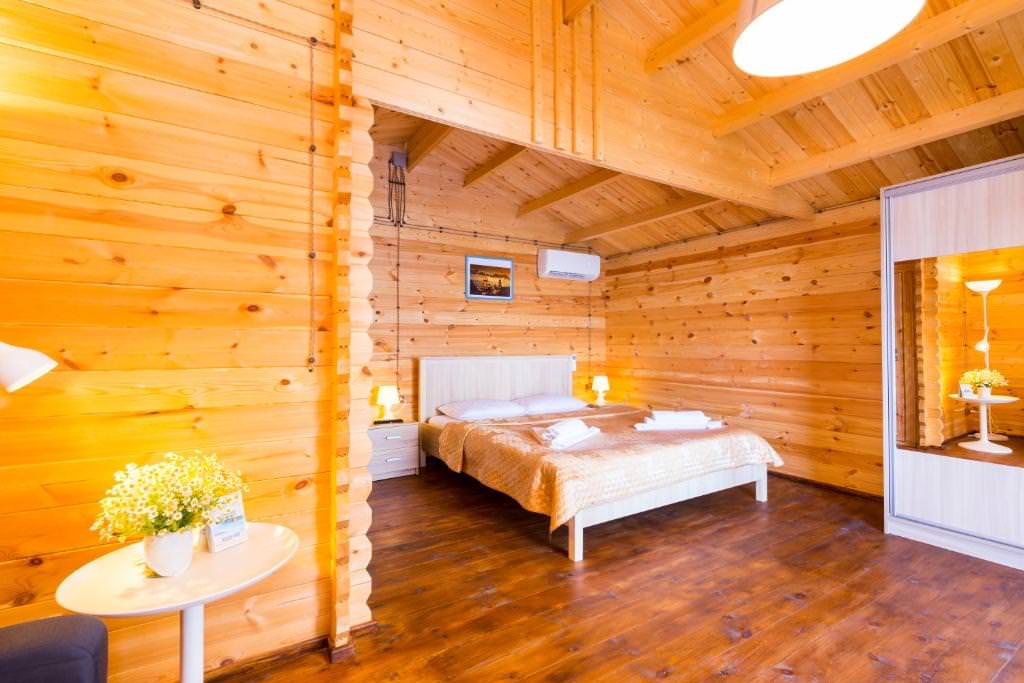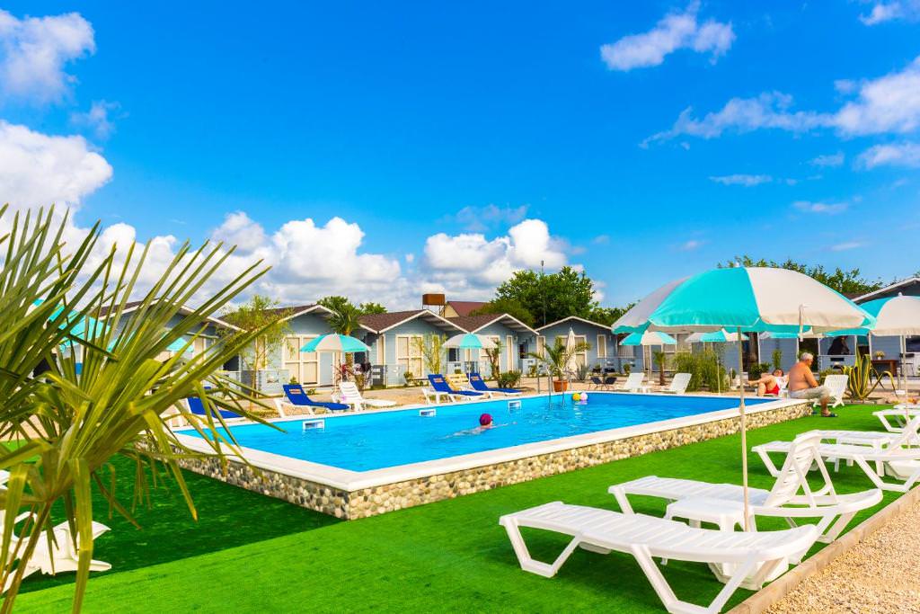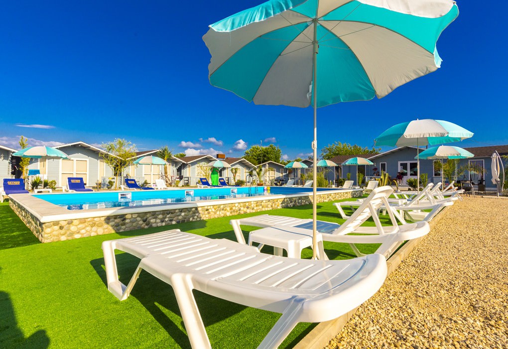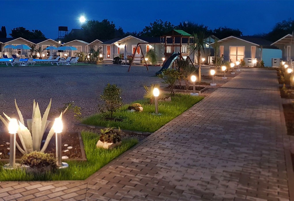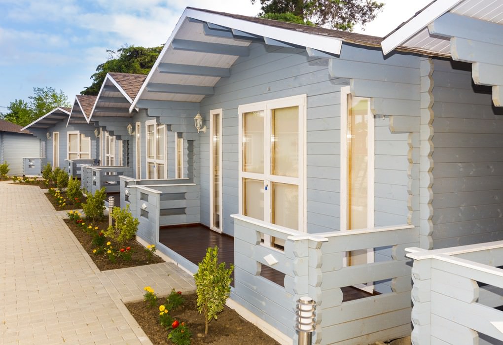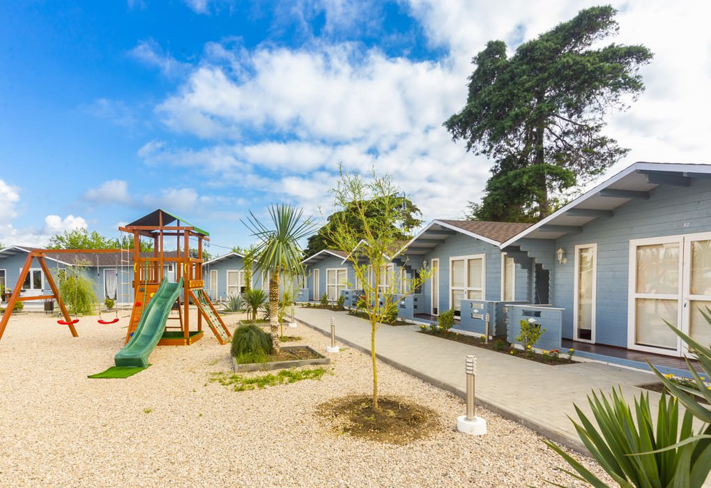Домики расположены вдоль границы двора, в каждом есть кондиционер, телевизор, фен, холодильник и wi-fi. Площадь двухместных коттеджей составляет 20 м2, предусмотрена установка дополнительных двух мест.