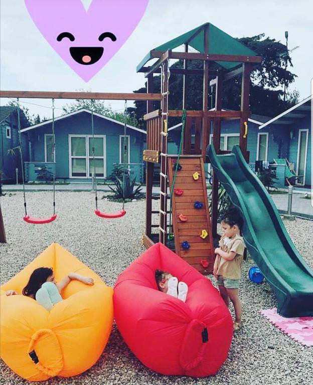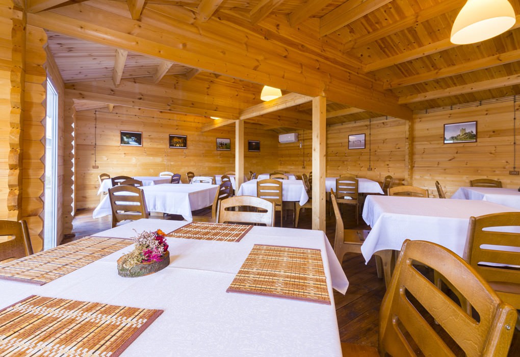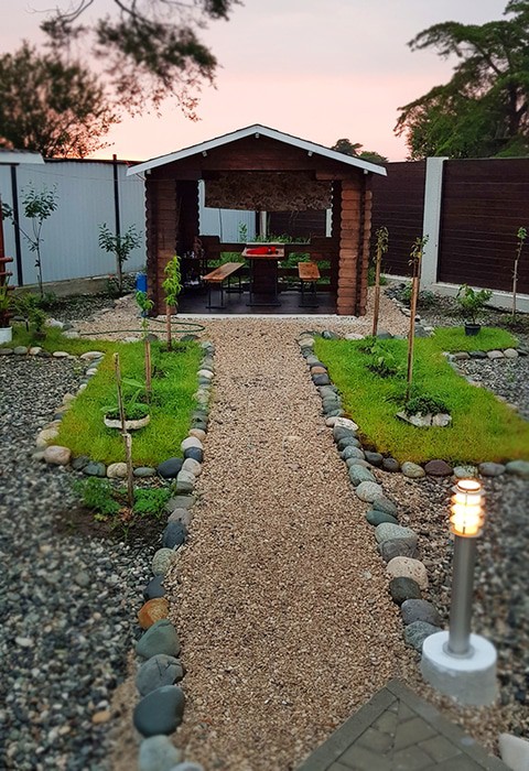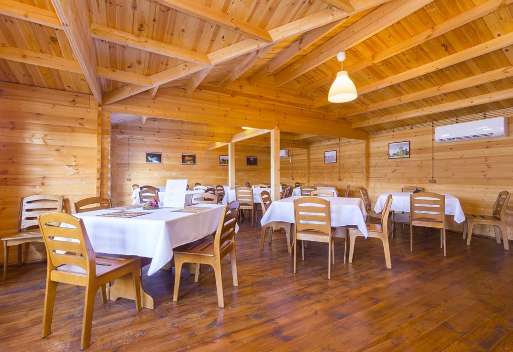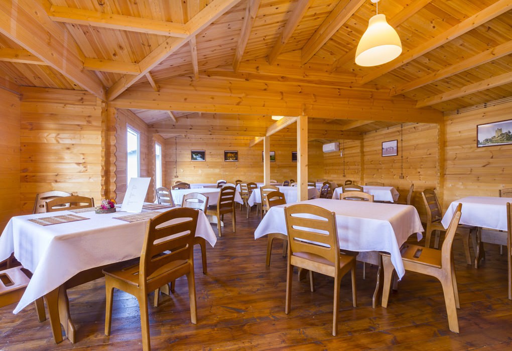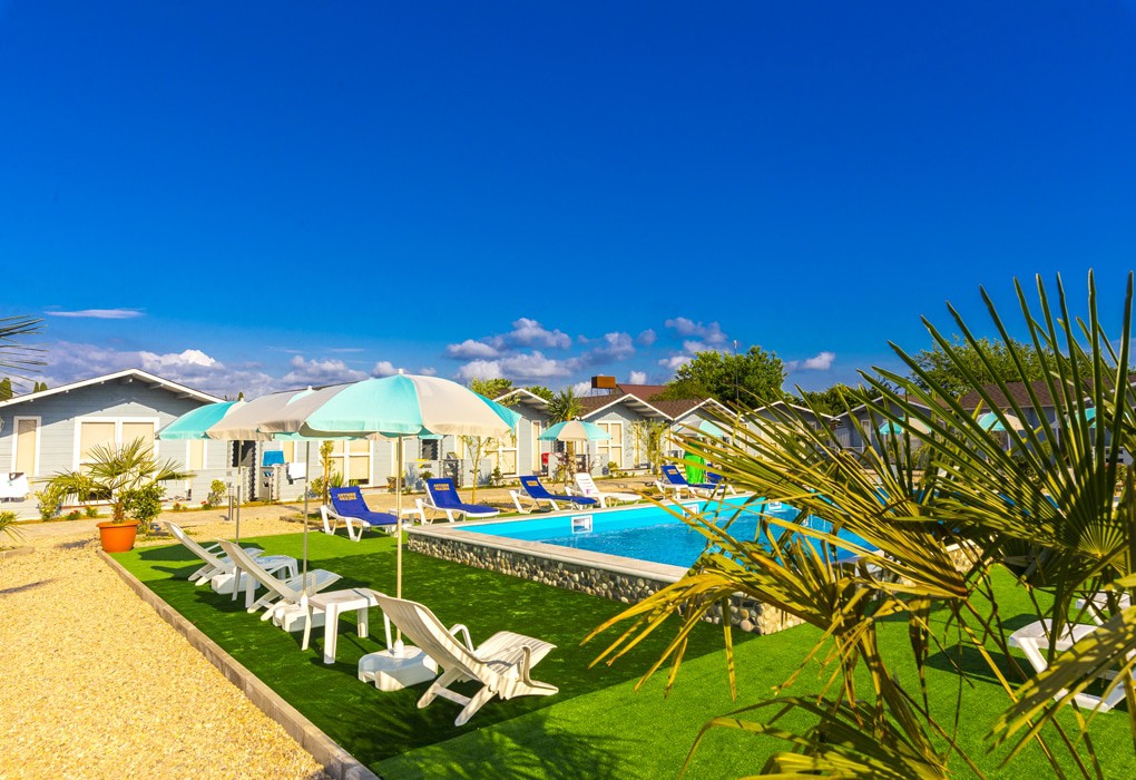 Домики расположены вдоль границы двора, в каждом есть кондиционер, телевизор, фен, холодильник и wi-fi. Площадь двухместных коттеджей составляет 20 м2, предусмотрена установка дополнительных двух мест.
